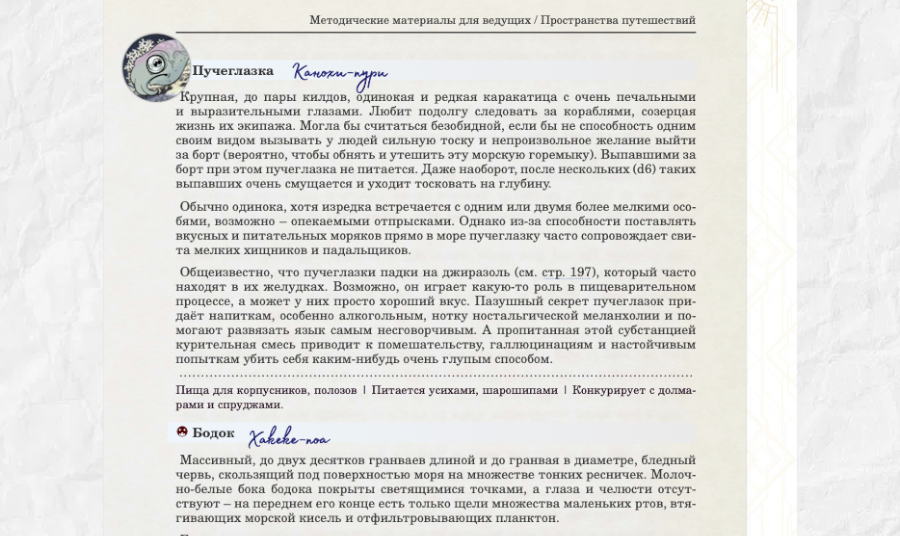 Ладно, серьёзно: это не Monster Manual, это тизер, сборник баек и россказней мореходов. Но все равно после пары страниц вы чётко осознаёте, что опасности в море — не только страховщики, конкуренты и налоговая. Есть вещи, которые хотят вас съесть, сломать или использовать в своих целях. Да, многие из них выглядят так, словно Миядзаки и Лавкрафт на спор собирали совместную коллекцию, но как по мне от этого только страшнее.