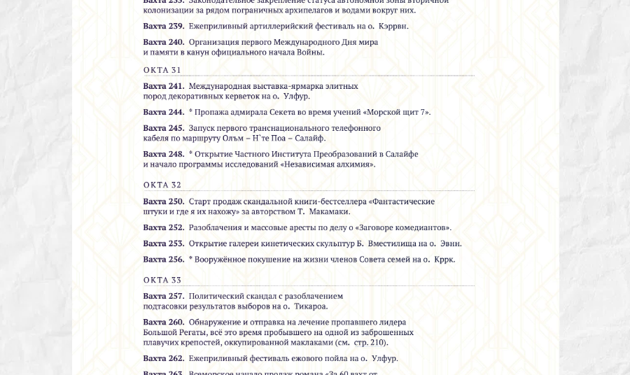 Следующая штука — частично прописанный (в ближайшее будущее!) календарь. Очень трезвый ход. Вместо того чтобы оставить всё “вечно текущим”, авторы дают расписание. Есть события, есть сроки, есть то, что случится “потом”, если игроки ничего не сделают и что случится, даже если они сделают всё. Ну да, AW-фронты, или “Pendragon” с его “год за годом” – но ну и что? См. выше, такие сапоги должны бы быть у каждого. И когда вы читаете календарь в Путеводителе, в голове впервые складывается: “ага, вот о чём всё это было”. Вот почему на первой книге висит табличка “Blessed Tide”. Потому что это не статичная картинка. Это прилив. После которого будет ещё один – и с шансами, куда менее “благословенный”.