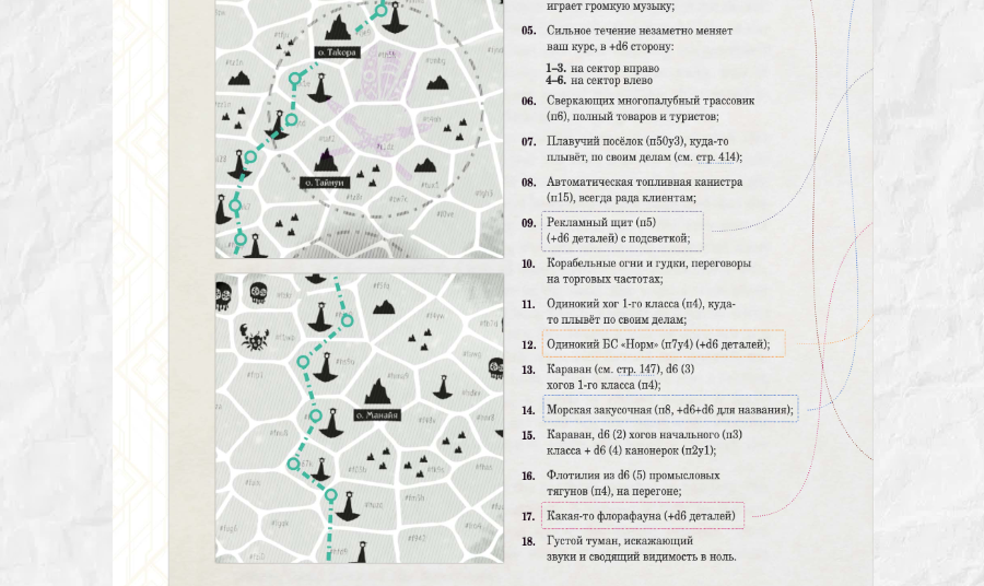 Иногда — доброжелательно. Иногда — так, что вы потом месяц будете рассказывать “как нас однажды чуть не съела штука из сектора #17b8”. Отсылки тут напрашиваются сами собой: “Sunless Sea”, “DREDGE”, старые морские легенды, OSR-модули, где каждая клетка карты — потенциальная история. И в отличие от многих “рандом энкаунтер таблиц”, здесь объекты завязаны на эстетику и смыслы “Укрытого Моря”.