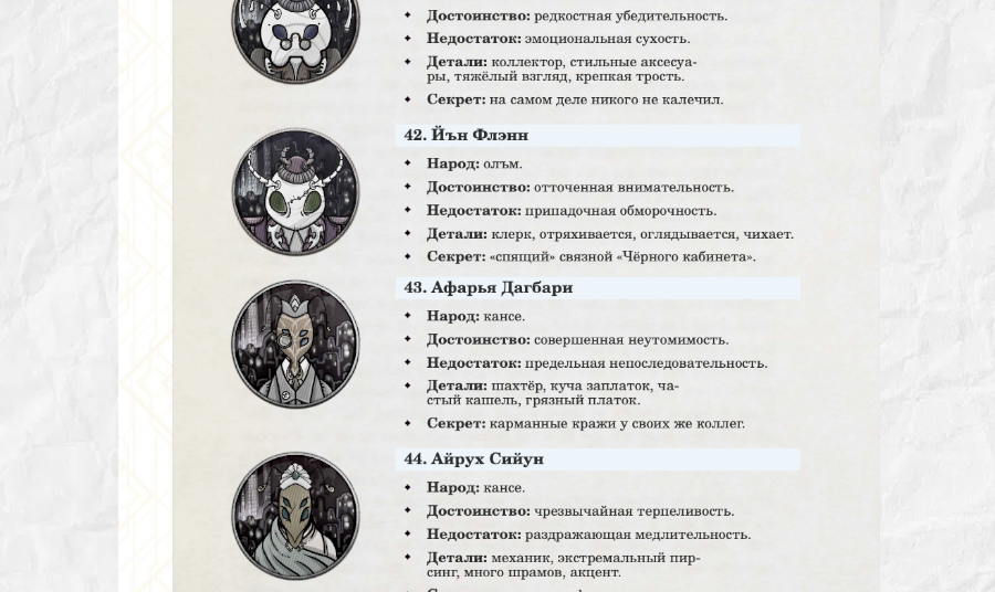 Таблички (NB: таблички ЖИВЫХ “теперь я – настоящий мальчик” персонажей ) тут — самое то, что нужно: вы не обязаны придумывать с нуля каждую фигуру в порту — открыли раздел, ткнули пальцем, подкорректировали пару деталей под свою кампанию. Любители “Stars Without Number”, старых DMG с их таблицами NPC и рандомных генераторов характеров оценят. Ну и да, как велит настроение игры, эти персонажи уже написаны с лёгким лирическим или сатирическим уклоном.